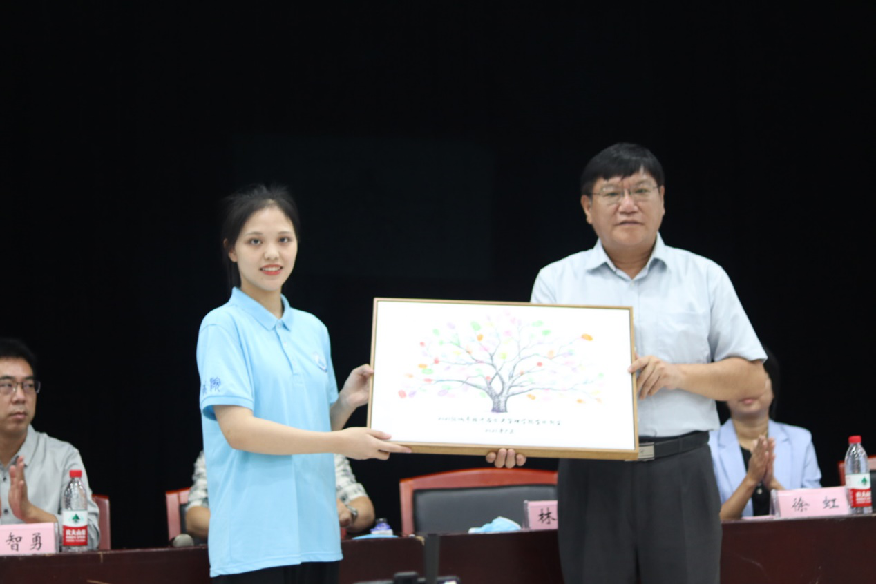 接着,她代表全体新生向学院赠送了新生精心制作的“城”长知"树”。用2021级新生指纹描绘而成的“城"长知"树”,象征着所有新生心手相连,在城院的这片沃土上用心成长,努力结出知识的果实。