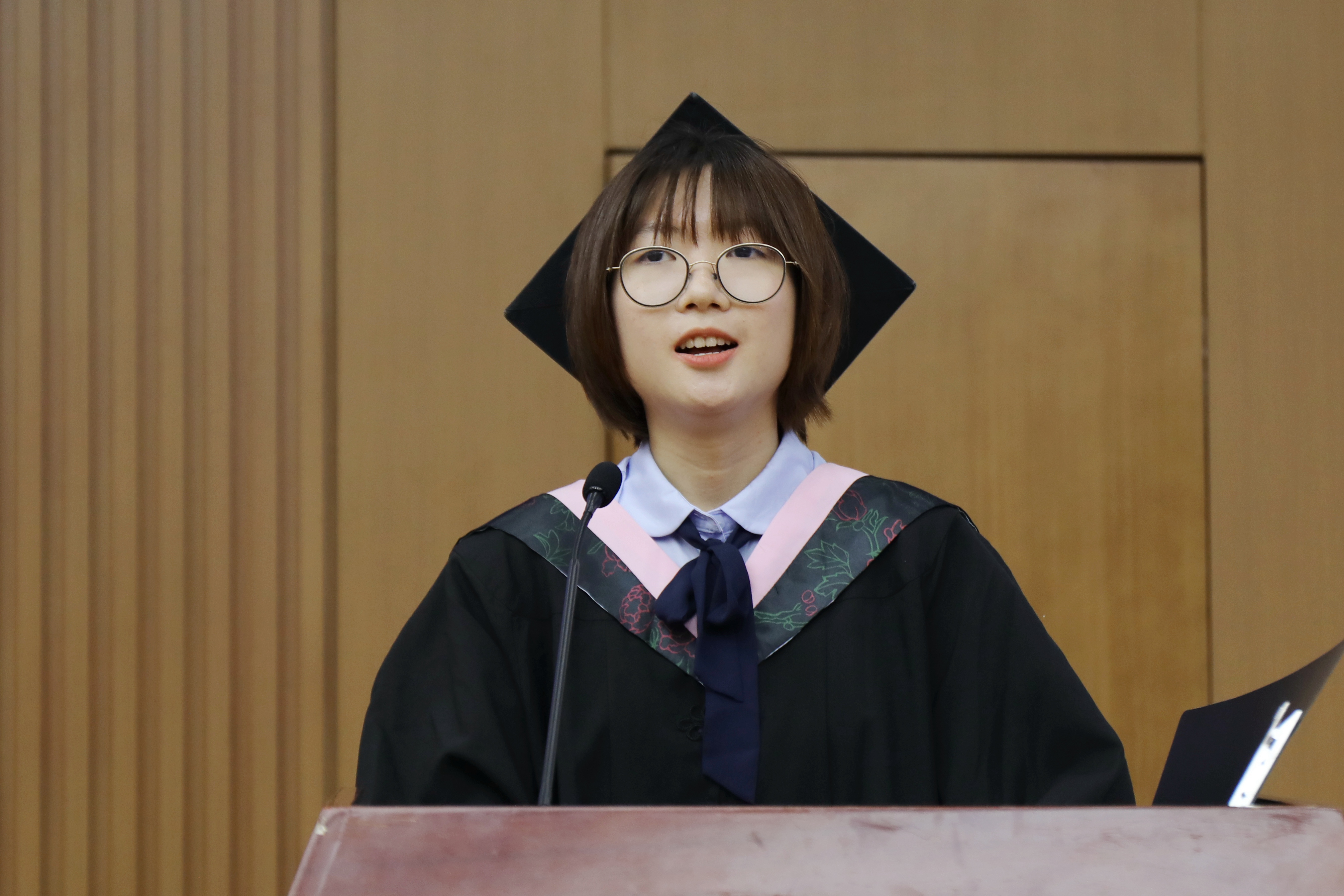 毕业生代表20行政管理专业本科生段玉回顾了过往四年的大学生活,深切感受到青春被赋予了更深刻的价值内涵,鼓励全体毕业生要保持蓬勃朝气、昂扬锐气、创新勇气,以勇担使命的魄力、战胜困难的毅力、不被裹挟的定力、激情澎湃的活力,昂首挺胸向前看,阔步肆意往前走,用实际行动唱响爱国爱党的青春之歌。