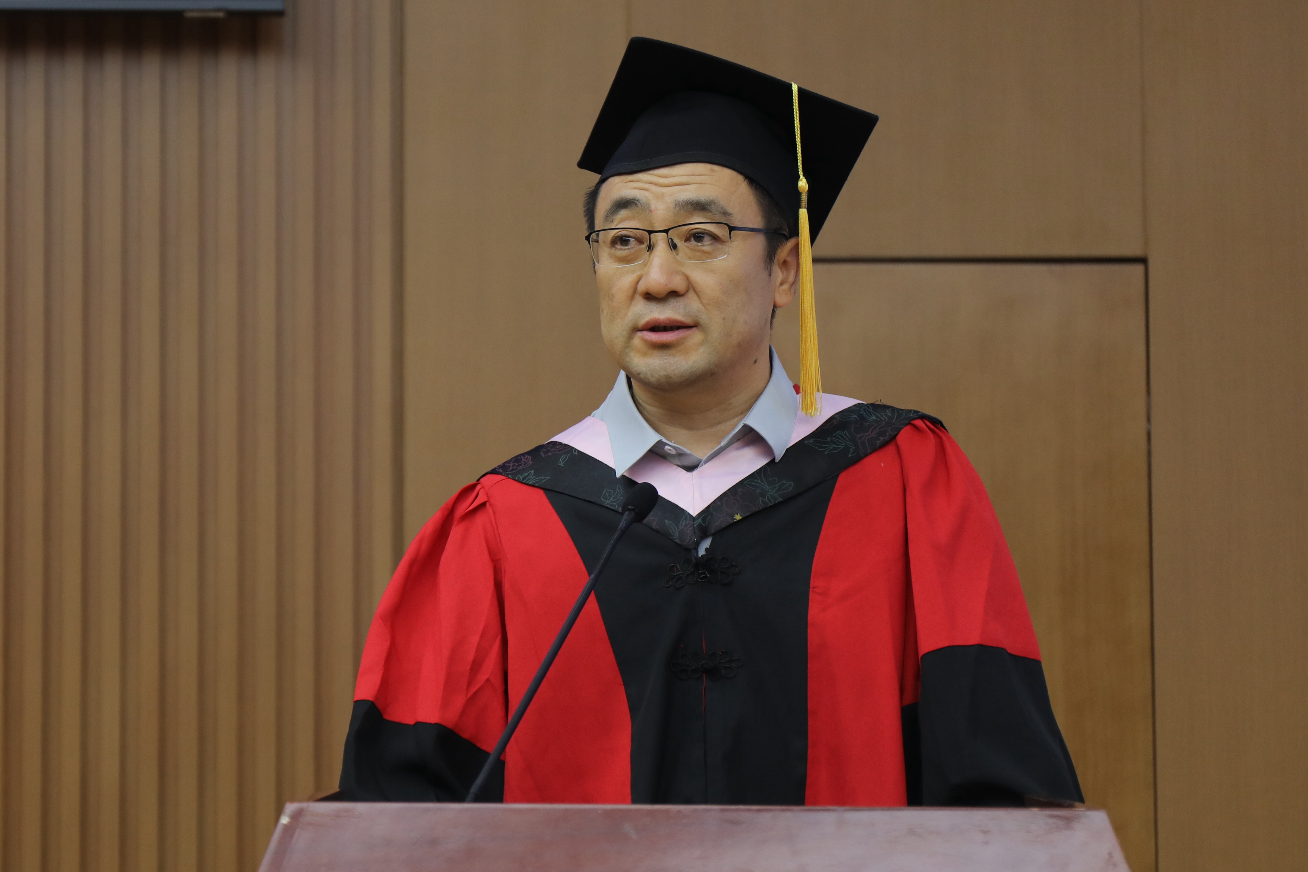 在热烈的掌声中,麻宝斌教授发表讲话。他首先代表第一会所 向顺利完成学业的同学们表示热烈祝贺,向悉心培育、关心支持同学们的导师和所有付出辛劳的教师表示衷心感谢。他指出,对于成功人们并没有一致的看法,仁者见仁,智者见智。同时,从“何为成功”和“如何成功”,将成功分为三重境界,分享了几点思考和对同学们的期待。第一重境界是个人意义上的成功,成功首先要具有稳定的价值观、强大的内核,也就是“心力”,即一个人的心理能量和精神力量。第二重境界是社会意义上的成功,要具有清晰的人生观——重新确立人与人之间的关系,社会成功不能靠个人单打独斗,而是要靠团队合作去造福社会。第三重境界是精神意义上的成功,要精神觉醒,真正认识到自己与世界的关系,明确自己的人生使命。最后他对同学们提出三点嘱托:一是要为自己书写自己的人生剧本,而不是按照别人的剧本生活;二是当面临人生关键选择时,要把“向下扎根,向上开花”作为人生方向,要把“向内成长,向外奉献”作为人生主线,要把“守住底线,不设上限”作为人生信条。三是要遵从内心的召唤,勇敢地去做真正热爱且擅长的事,长风破浪会有时,直挂云帆济沧海!