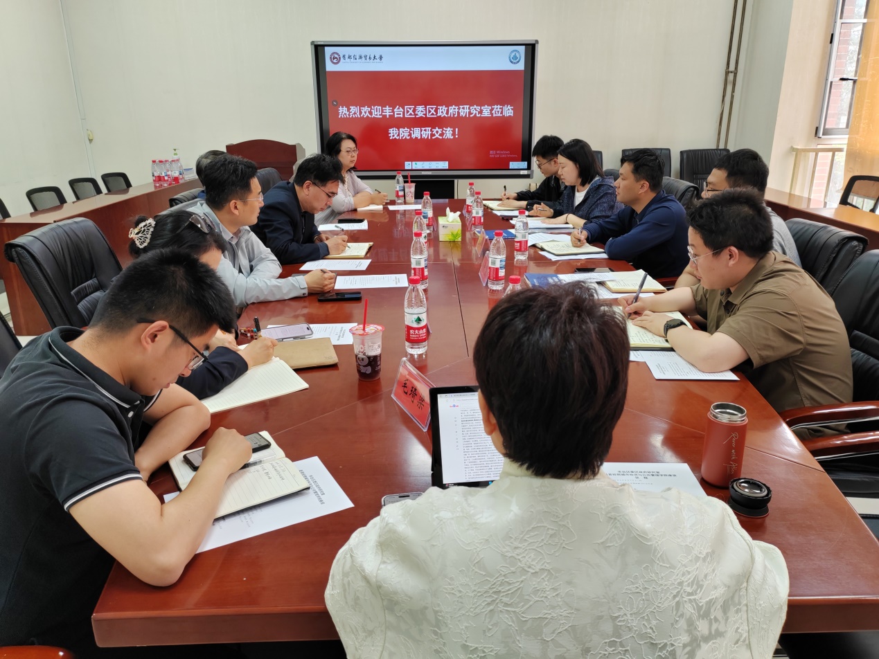 丰台区委改革办副主任霍海宁介绍了丰台区近年的发展变化和此行调研目的,对学院近年来给予的大力支持表示感谢。他表示,当前丰台区正处于落实首都功能定位、建设现代化新城区的关键阶段,亟需借力高校科研力量破解发展难题。他希望双方建立常态化合作机制,重点在改革攻坚课题研究、科研成果转化应用等方面深化协同,共同打造“政产学研用”一体化创新平台。特别是支持区委区政府高质量完成“营造环境、塑强功能”重点研究任务,为丰台区城市高质量发展、提升城市治理效能、培育新质生产力注入动能,为“十五五”规划先行研究奠定坚实基础。