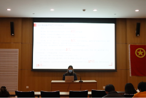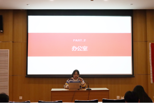 组织部总结完毕后办公室的部长燕酝青同学首先总结报告了办公室的常规工作,接着介绍了办公室其余工作以及部员们的任务分配情况,对大一新部员的工作完成情况提出表扬,最后对办公室部门下学期作出展望,提出以下三点要求:按部就班地完成办公室常规工作,通知上传下达及材料收集,团支部考核、台账填写;为值班同学适当安排本部门相关工作,如台账相关数据整理;加强各部门之间的配合,让分团委变得更加团结友爱。