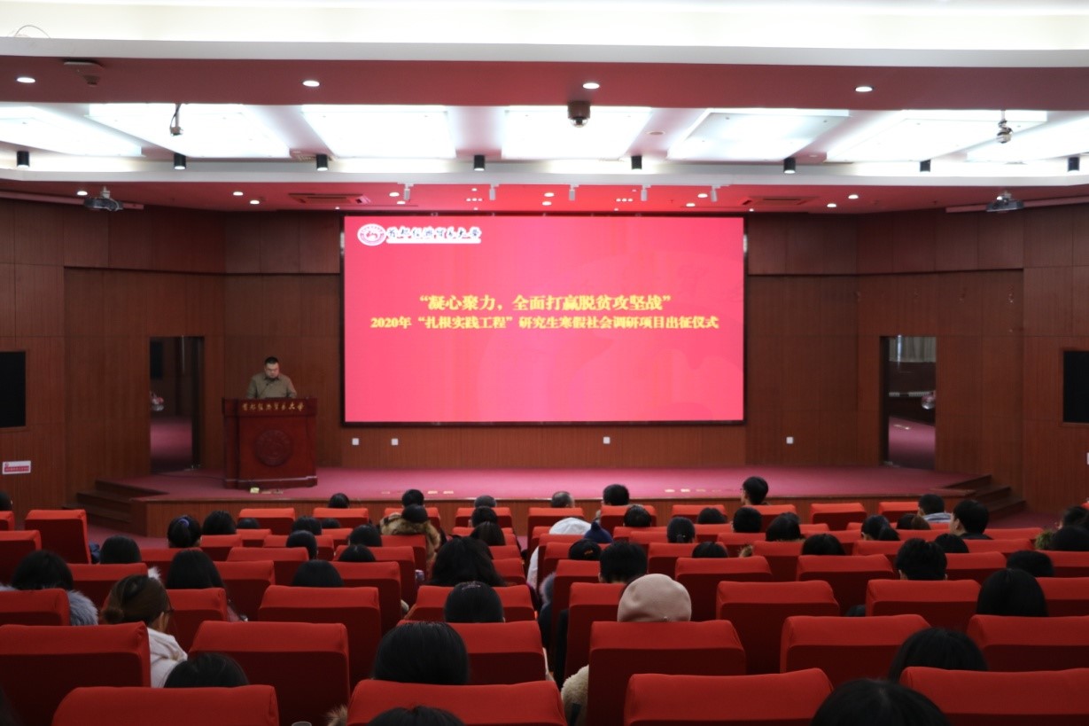 2020年1月3日上午9点,以“凝心聚力,全面打赢脱贫攻坚战”为主题,2020年“扎根实践工程”研究生寒假社会调研项目出征仪式在第一会所 博学楼学术报告厅举行。本次活动旨在向参与此次调研的同学说明本次社会实践活动的各项事宜,以推动实践顺利开展。研究生院院长、研究生工作部部长周明生教授,工商管理学院副院长范合君教授、国务院国家脱贫攻坚第三方评估团队负责人、经济学院沈宏亮教授,部分学院辅导员、研究生工作部教师以及立项研究生代表参加了此次大会。大会由研究生院副院长、研究生工作部副部长蔡斌主持。