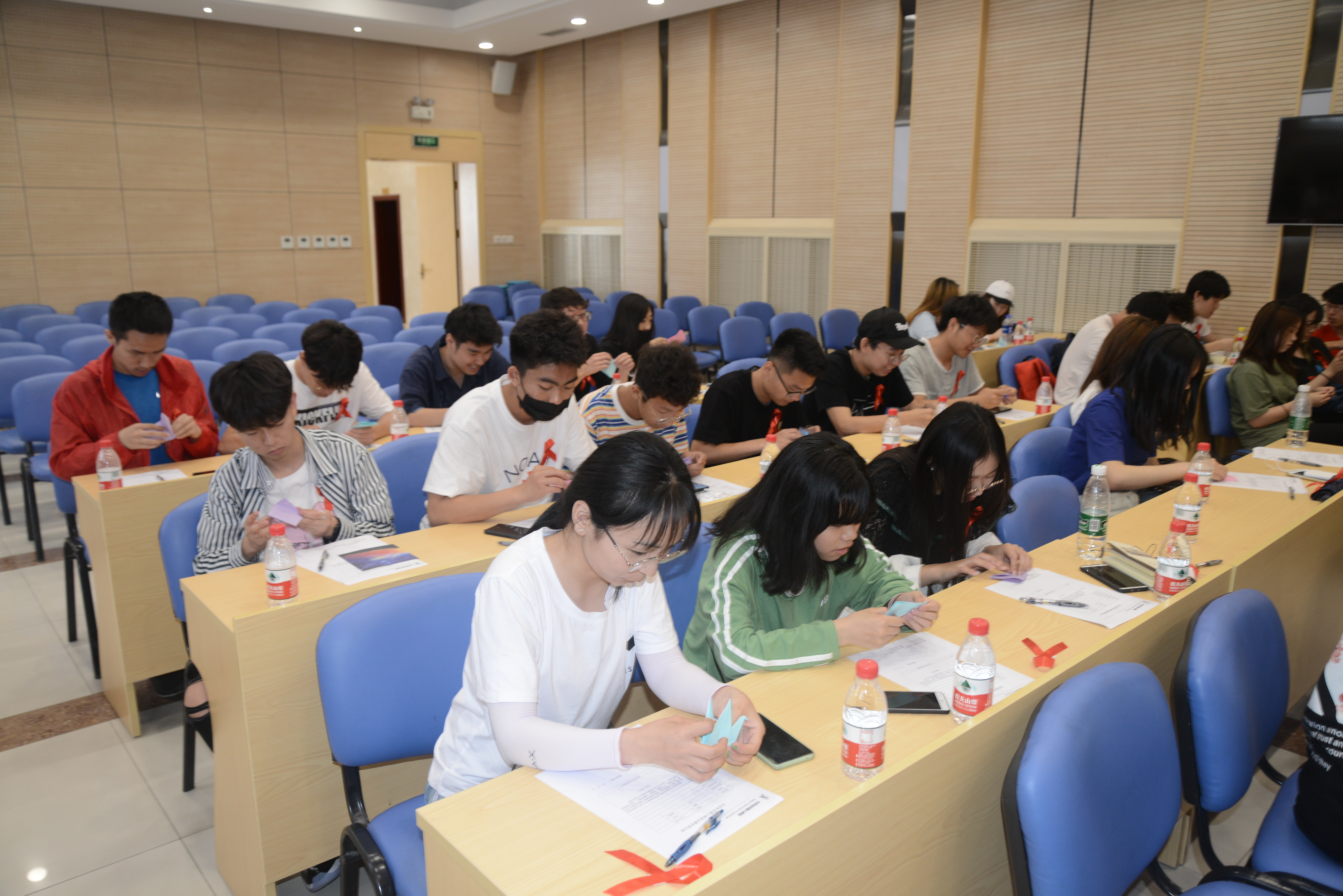 然后,为了表达对艾滋病患者的关怀与祝福,爱心家园还特别安排了“小小千纸鹤,情系千万爱”环节。由爱心家园李超老师组织同学们亲自动手,将自己祝福话语写在纸上,并叠成千纸鹤。同学们的声声问候、暖暖心语都将飞进患者心中,以此鼓励HIV感染者勇敢的与艾滋病魔作斗争。