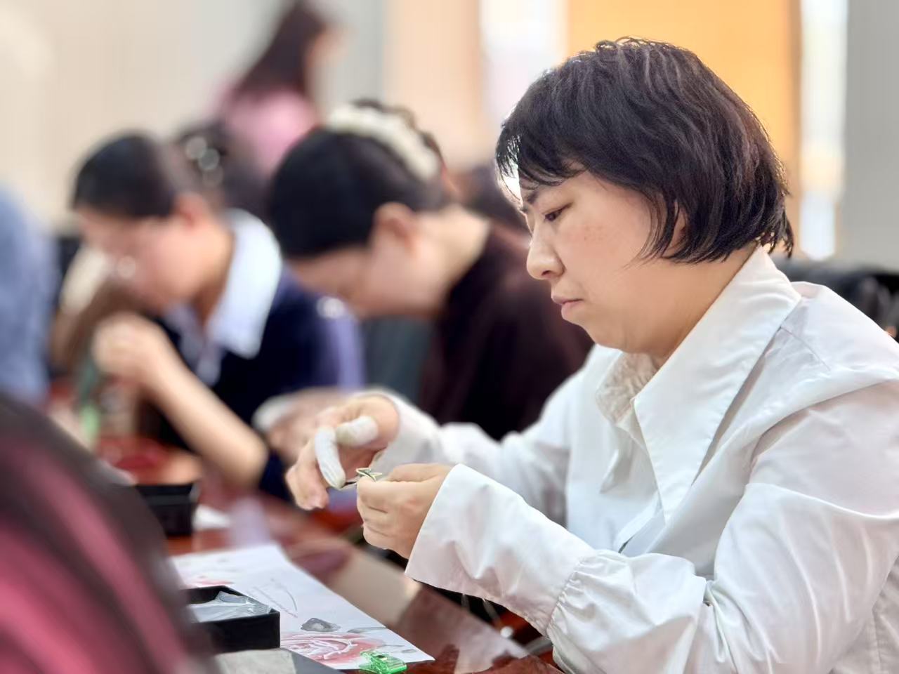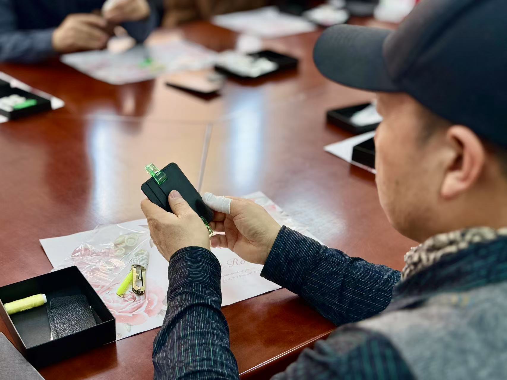 皮具DIY是一项充满创造性的活动,能让参与者根据自身喜好与需求,亲手打造独一无二的皮具产品。活动现场,摆满了各类皮具制作工具和材料,气氛温馨而热烈。在专业老师的悉心指导下,老师们认真学习传统缝制工艺,从切割皮革、打孔定位,再到穿针引线进行缝制,每一个步骤都专注而投入。大家相互交流、分享经验,遇到问题时积极讨论解决方案。在一针一线的穿梭间,原本普通的皮革逐渐有了形状,变成一件件饱含心意与创意的精美作品。