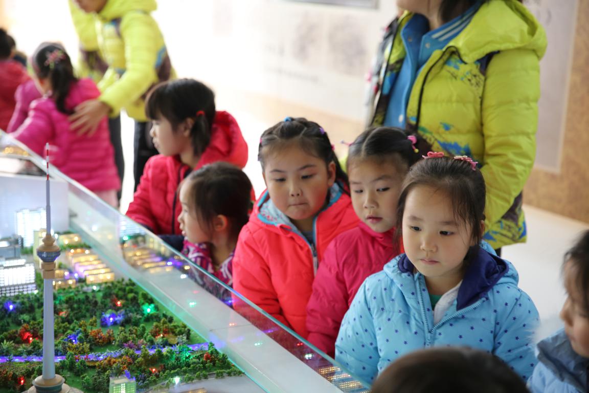 首先,幼儿园的小朋友们在幼儿园老师们的带领下来到实验室。陆辉老师展示了实验室的互动沙盘危机体验系统,小朋友们被沙盘模型深深地吸引。