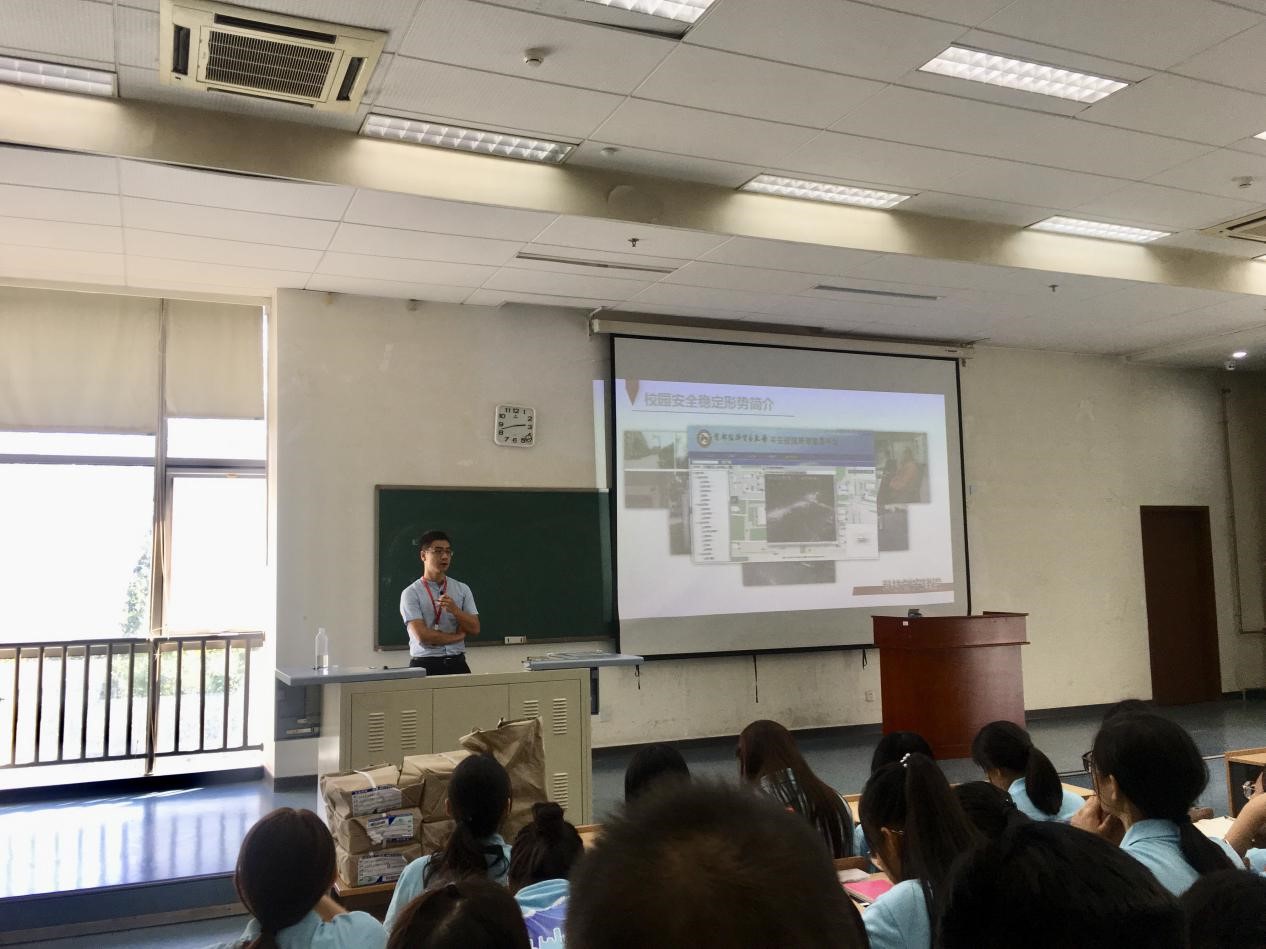 下午两点半,保卫处的胡文为第一会所 的新生做安全教育讲座。讲座的内容包括消防安全、交通安全及同学们日常的治安防范。胡文当场告知同学们学校保卫处的求助电话以及学校所在辖区樊家村派出所的报警电话,再三强调遇到险情一定牢记人身安全第一的原则,第一时间报警求助。
