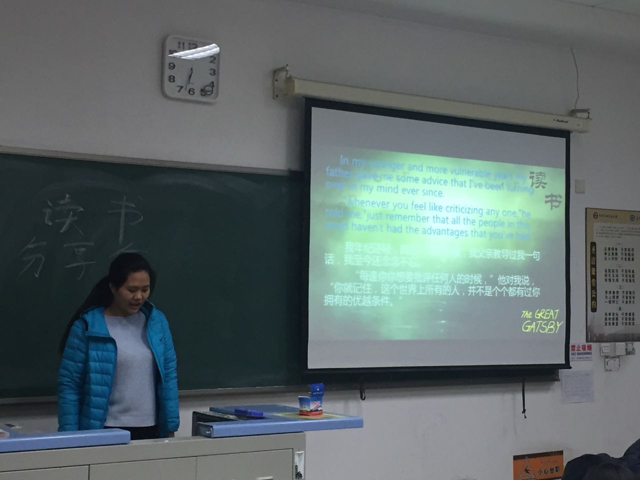 12月8日,在2016级新生晚自习时间,第一会所 举办第三期“我的乐读故事”晚自习班级读书沙龙,2016级新生各班按照抽签决定的顺序,逐一向大家推荐了一本本此次活动推荐书单上的好书,并配合PPT演示文稿分享自己与阅读的故事。