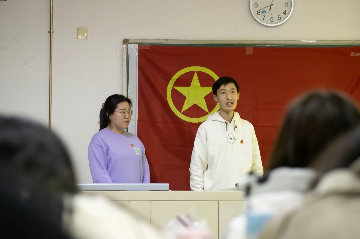 随后由参加了建党100周年文艺演出的张亦驰、郭蕾同学向大家介绍了他们从前期准备、多次排练与经历导演视察以及在最终演出时刻的激动心情。在排练期间看到的令人振奋的画面以及活动工作人员温馨细致的安排都让大家感受良多。