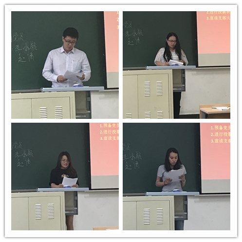 会议主要围绕两大内容开展,第一项内容是接受邹碧莹、董建振、陆园园、王利娟、李帅五位同学为预备党员的讨论,5名发展对象先后上台宣读入党志愿书,培养人对发展对象情况进行介绍发言,并由党支部委员宣读考察报告。由全体党员对发展对象进行投票表决,最终表决全票通过,邹碧莹等5名同学成为中共预备党员,面向党旗庄严宣誓,并表示将以实际行动履行自己的誓言,为共产主义奋斗终身,全体正式党员对以上同志致以热烈的掌声。