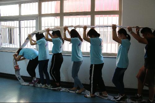 除此以外,有的班级还开展了“盲人方阵”“班级狼人杀”等多种破冰活动。每一个人都参与到活动中来,例如“盲人方阵”,所有队员蒙上眼睛,在四十分钟内,将一根绳子拉成一个最大的正方形,并且所有队员都均可分在四条边上。这个就很是考验团队沟通力、领导力,解决问题能力。