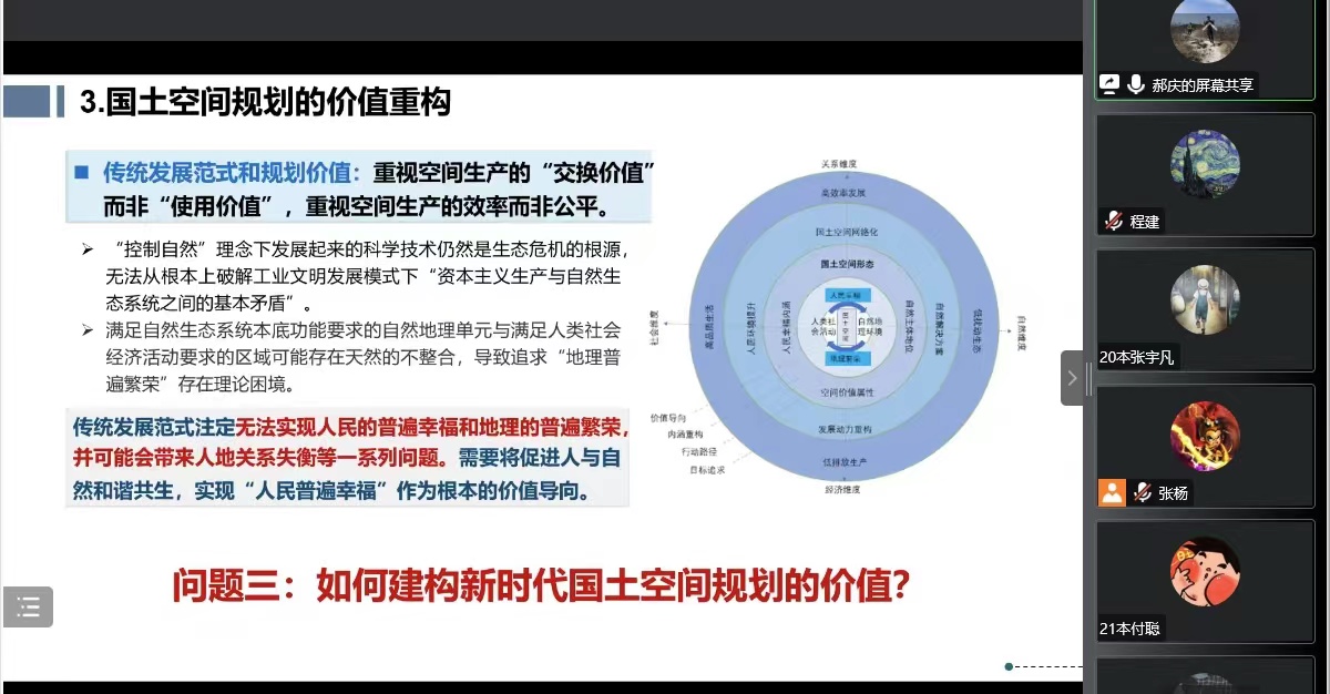 12月9日下午,土地资源管理专业建设30周年系列活动——“谈土论房”学术论坛以线上会议形式成功举办。本次专家论坛邀请到自然资源部青年科技人才、中国自然资源学会资源工程专业委员会副主任、国土空间规划研究专业委员会副秘书长、《全国国土规划纲要(2016-2030年)》首席专家组专家/咨询委员会委员、清华同衡规划设计研究院总体研究中心郝庆总工程师,作题为“国土空间的本质解析与国土空间规划的价值导向”的报告,本次讲座由土地资源管理系张杨副教授主持。师生及相关单位共百余人参会,学术氛围浓厚。 ...